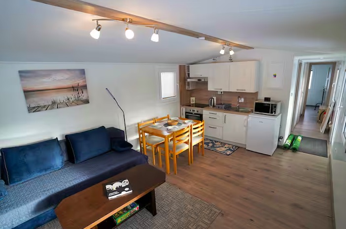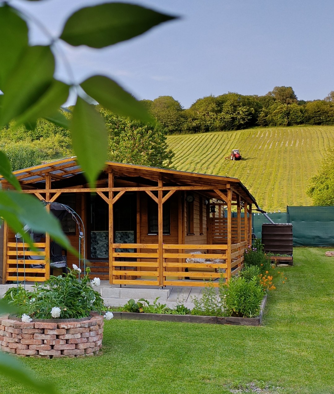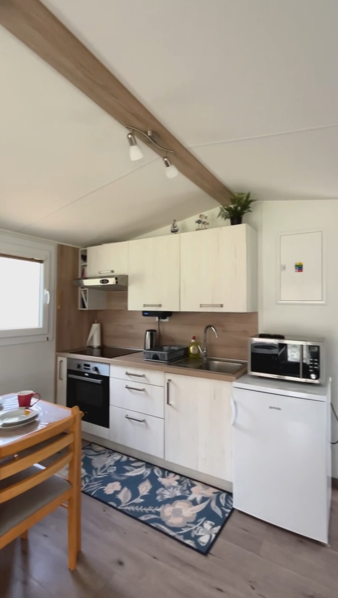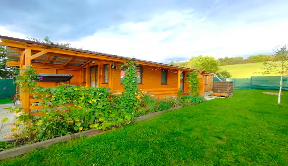 A WOOD mobile home with two bedrooms, a lovely terrace, and a large garden.