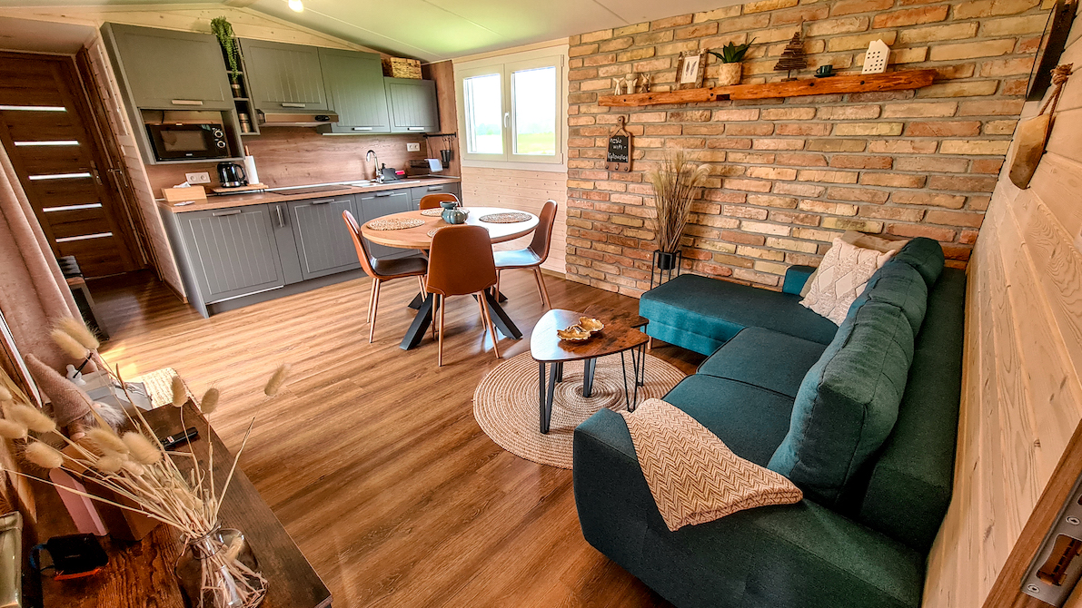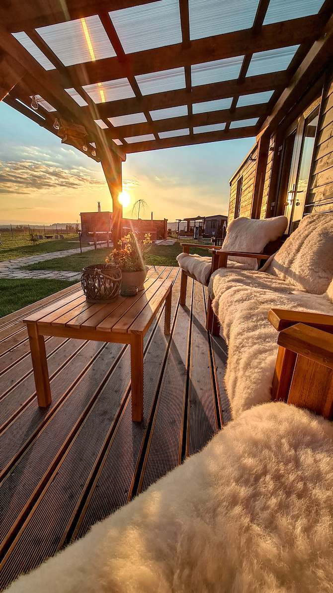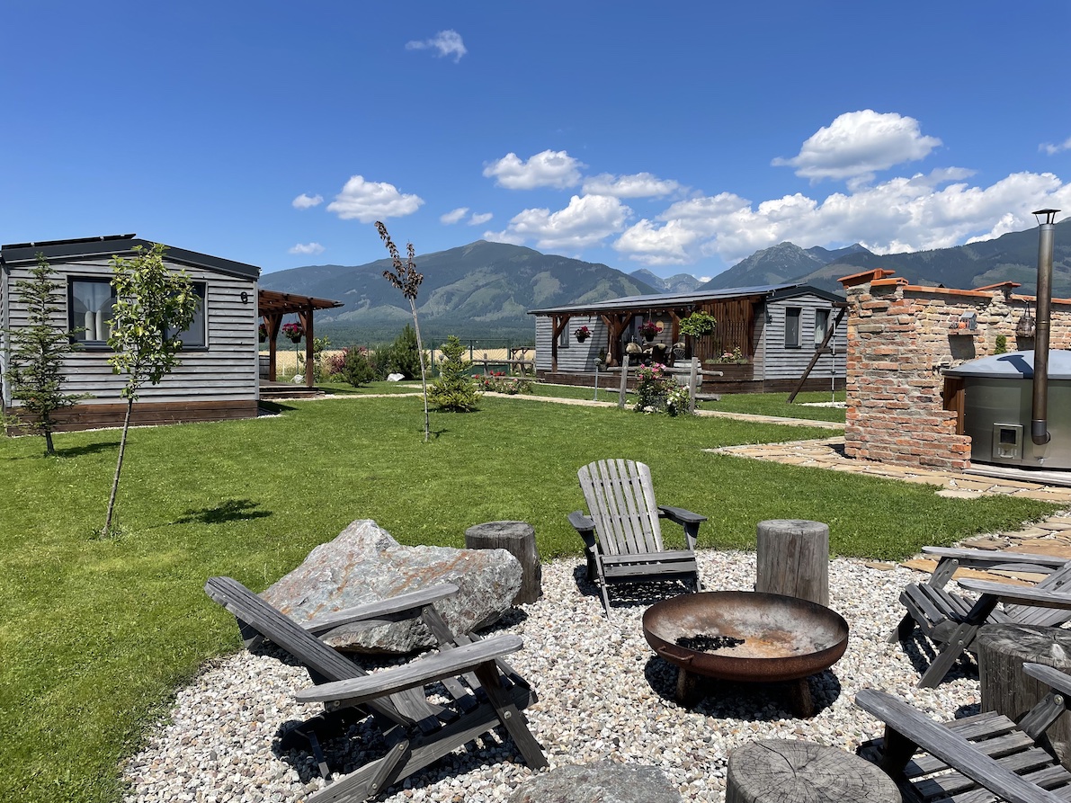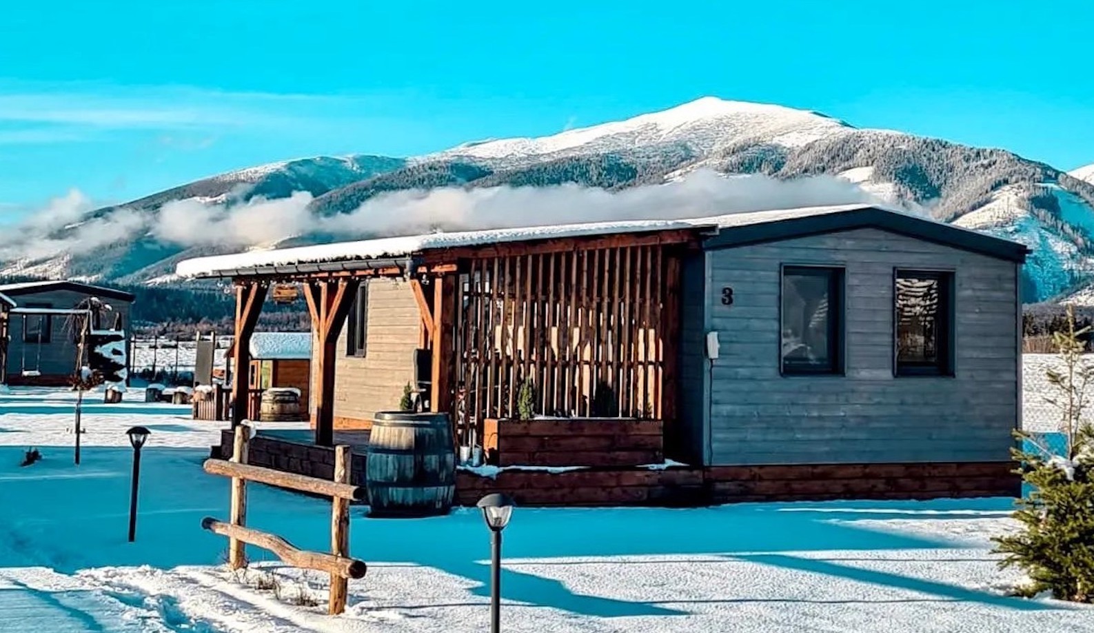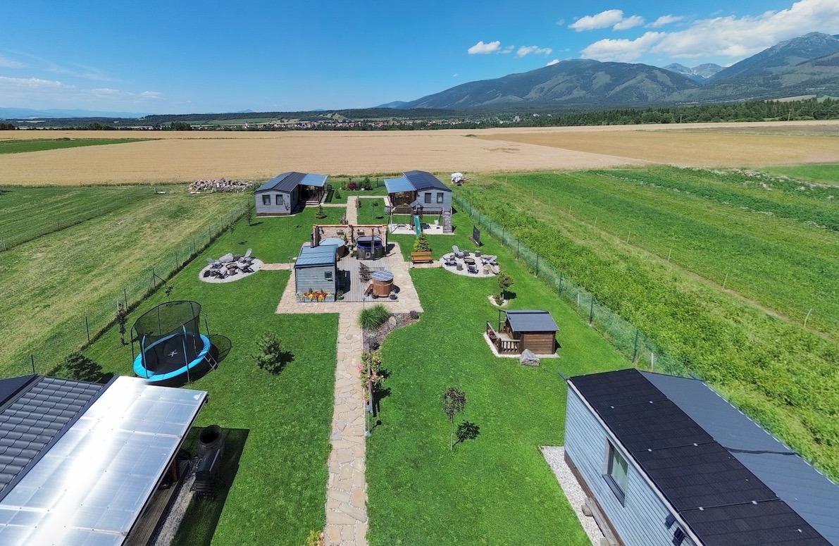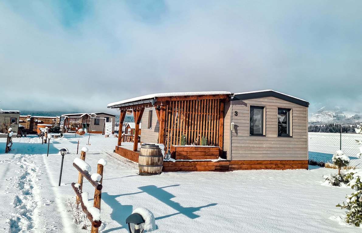 Four WOOD mobile homes, each with two bedrooms, a terrace, and private outdoor wellness facilities.