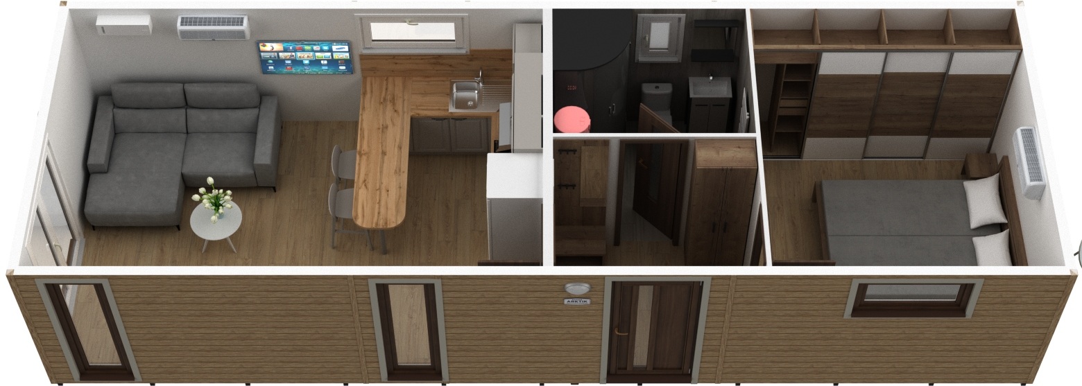 The all-year mobile home SUPER ARKTIK® with approximate dimensions of 12 × 4 m (11 × 3.8 × 3.2 m) represents a fully functional and modern housing solution. It stands out for its high-quality workmanship, practical layout, and comfort for year-round use.