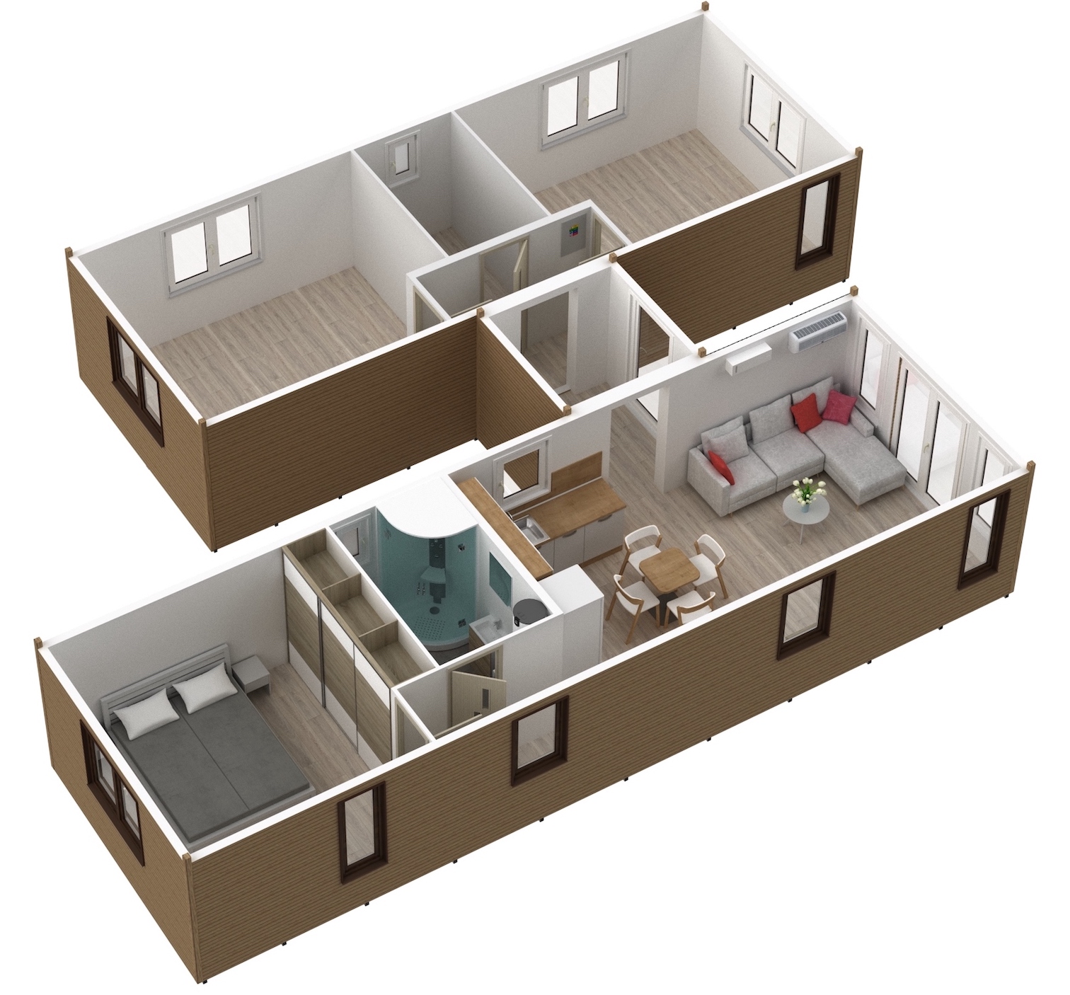 We offer year-round Super Arktik® mobile homes for sale, which, once connected, create spacious and comfortable living with a total area of up to 88 m². An ideal solution for those looking for a modern, fully equipped home. The two mobile homes are connected by a functional linking corridor, creating a full-value living space with large rooms. The homes are suitable for year-round use in any conditions.
