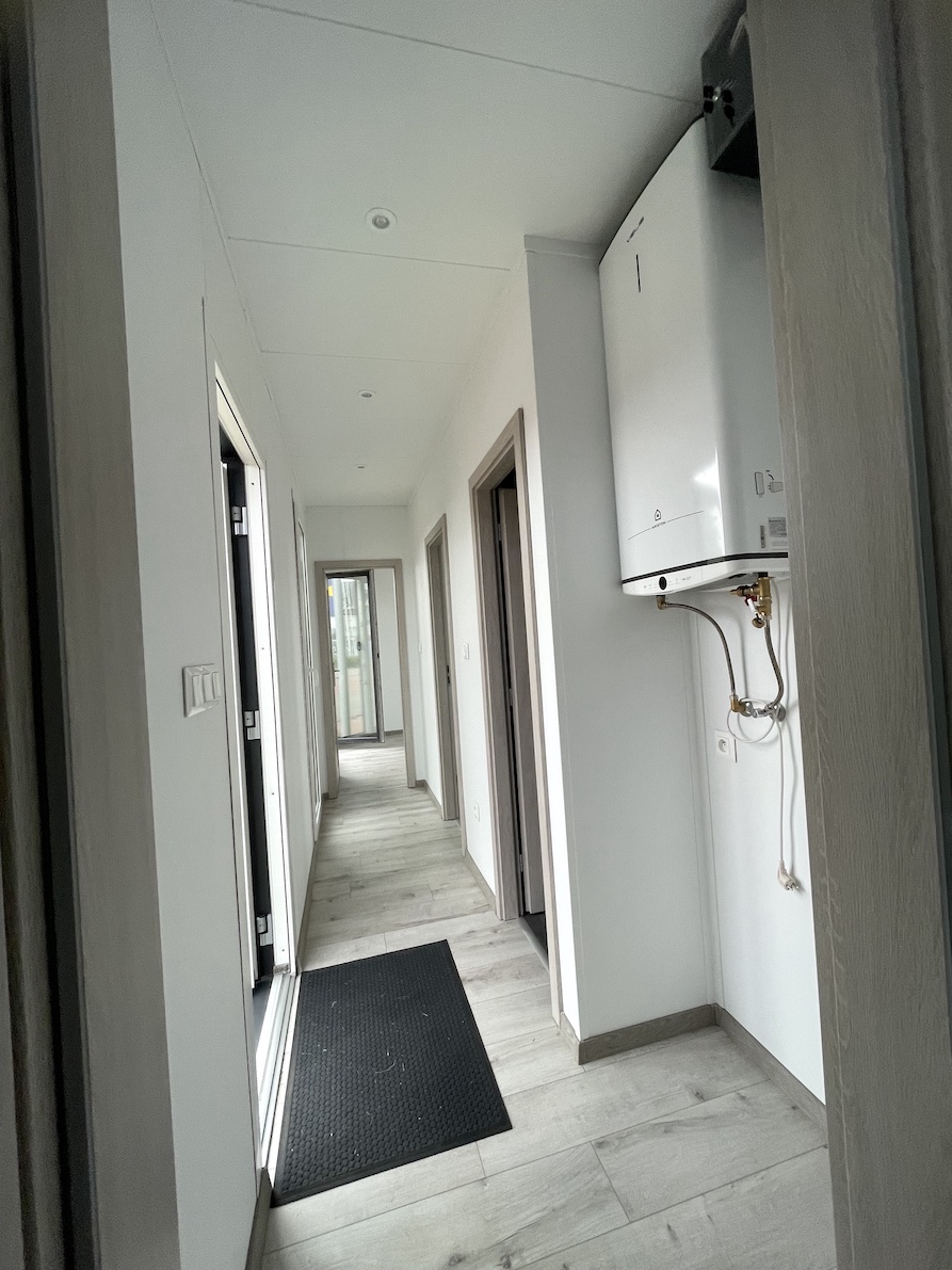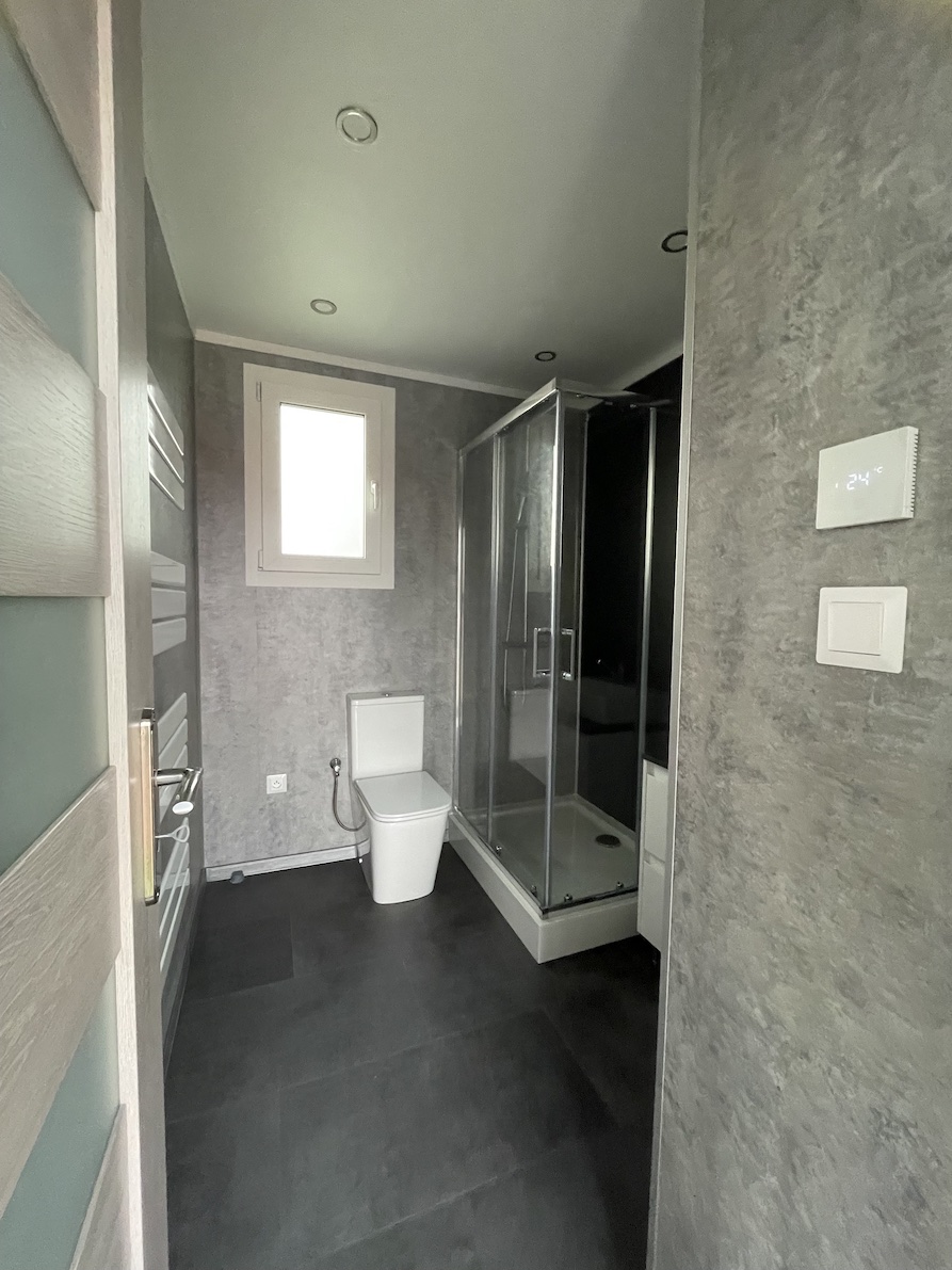 Bathroom fully equipped with a shower enclosure, washbasin, toilet, faucets and a boiler.